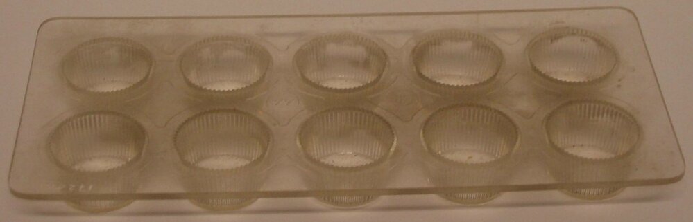 - BeschrijvingDoorzichtige kunststof vorm met daarin verdiept tien vormpjes met gekartelde rand.