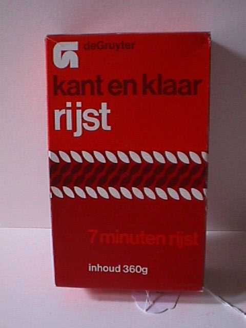 - BeschrijvingKartonnen verpakking van kant en klaar rijst, 360 gram. De verpakking is rook met wit. Op de ene zijkant staat gebruiksaanwijzing en op de andere zijkant de voedingswaarde. Het pak is leeg.