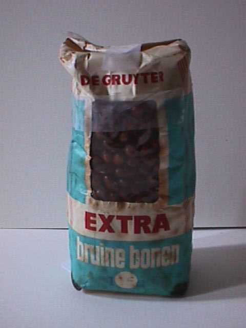 - BeschrijvingPapieren verpakking van extra bruine bonen, 500 gram. De verpakking is blauw, rood en cremekleurig. In de voorzijde zit een doorzichtig kijkvenster en op de achterzijde staat de gebruiksaanwijzing. Het pak is vol.