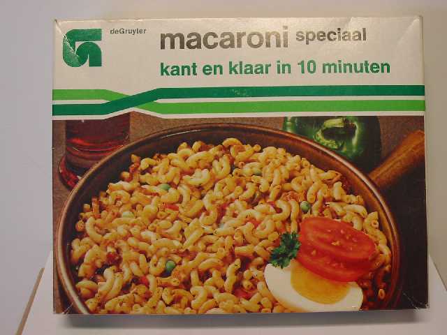 Kartonnen verpakking van macaroni speciaal, kant en klaar in tien minuten, 235 gram voor twee personen. Op de voorkant staat een volle schaal met macaroni, gegarneerd met tomaat, ei en peterselie. Links van de schaal zie je deels een glazenvoorwerp, rechts van de schaal ligt een groene paprika. Op de achterkant staan algemene kookvoorschriften en menu-tips. Op de linker zijkant staat de voedingswaarde. Het pak is leeg.