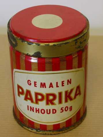 Metalen rood-gouden strooibus met draaiafsluiting zuivere gemalen paprika, 50 gram. Boven op de bus zit een witte stip.
