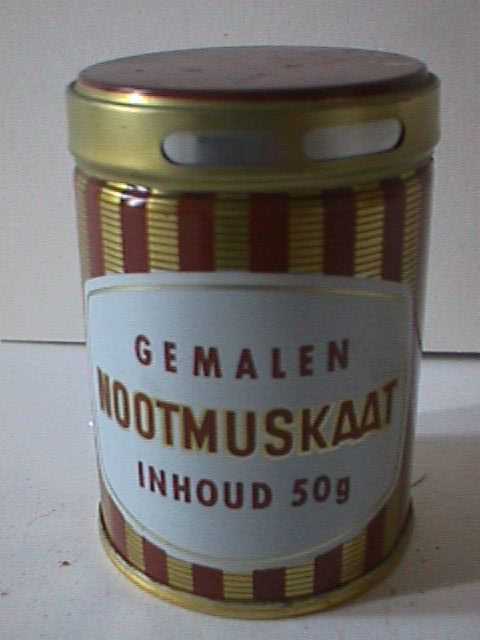 - BeschrijvingMetalen strooibus met draaiafsluiting zuivere gemalen nootmuskaat, 50 gram. De bovenkant van het deksel is bruin, de zijkant van het deksel is goudkleurig. De zijkant van het blik is om en om goudkleurig en bruin gestreept in vertikale richting. Dwars op deze banen lopen dunnen bruine strepen. De onderkant is goudkleurig. De bus is (gedeeltelijk) vol.