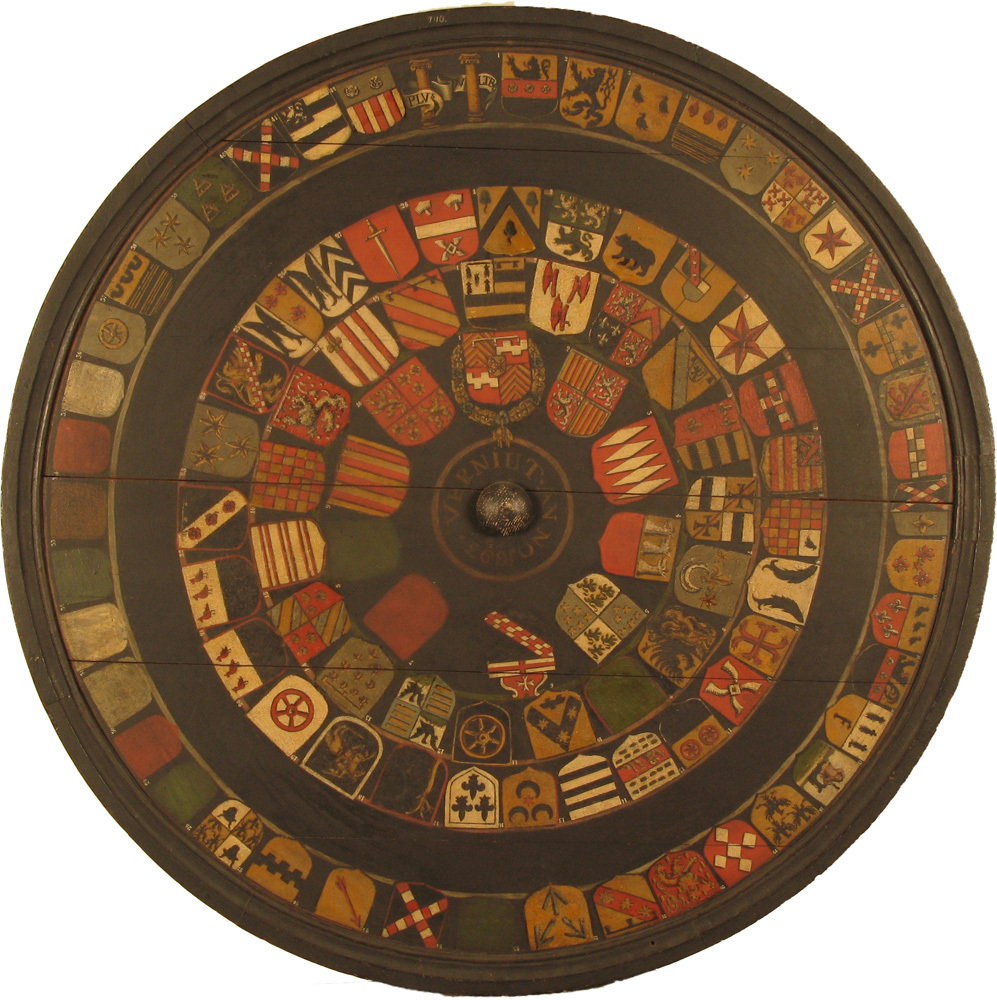 Rond tafelblad, afkomstig uit de gaffelkamer in het stadhuis te 's-Hertogenbosch. Dit vertrek was vroeger bestemd voor vergaderingen van de broederschap of het gilde der Gaffelbroeders. De gaffelbroeders waren voorname heren uit 's-Hertogenbosch en de Meierij. In de 15de en 16de eeuw zouden zij de verdediging van hun streek tegen de Gelderse invallen hebben voorbereid. Ook hoge edelen, waaronder vliesridders, woonden de feestelijke maaltijden van dit gezelschap bij. Hun wapens staan afgebeeld in het midden van de wapenborden. Het blad was oorspronkelijk tegen het plafond van deze kamer bevestigd. Beschilderd met de wapens van de Gaffelbroeders, afkomstig uit adelijke en andere voorname families uit 's-Hertogenbosch. Opschrift in het midden: "ANNO 1693.VERNIUT."