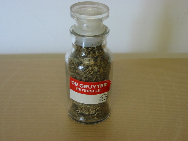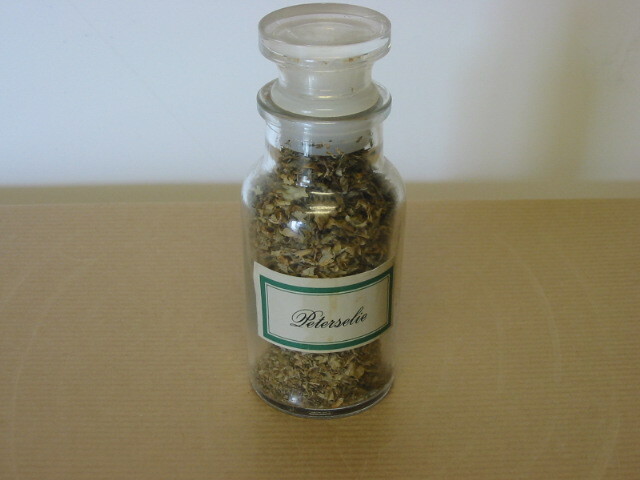 Doorzichtige glazen pot met kunststof klemdop al dan niet gevuld met peterselie.