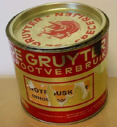 - BeschrijvingRond metalen blik De Gruyter grootverbruik specerijen notemuskaat. Het blik is gemaakt in de kleuren rood en goud. Op de gouden rand in het midden staan twee rode grote zeilschepen. Op de bovenkant van het deksel staat ook een zeilschip. In de onderste rode rand staan twee goudkleurige vrachtauto's afgebeeld. Het blik is leeg.