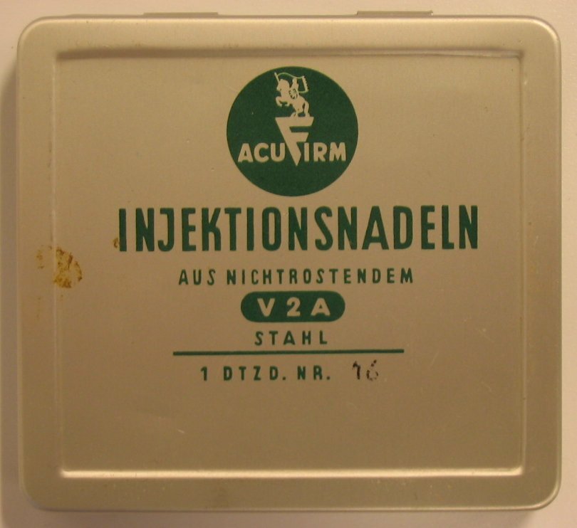 - Beschrijvingvierkanten metalen doosje met scharnierend deksel. De twaalf naalden liggen op een metalen plaatje en zijn met het plaatje verpakt in cellofaan.