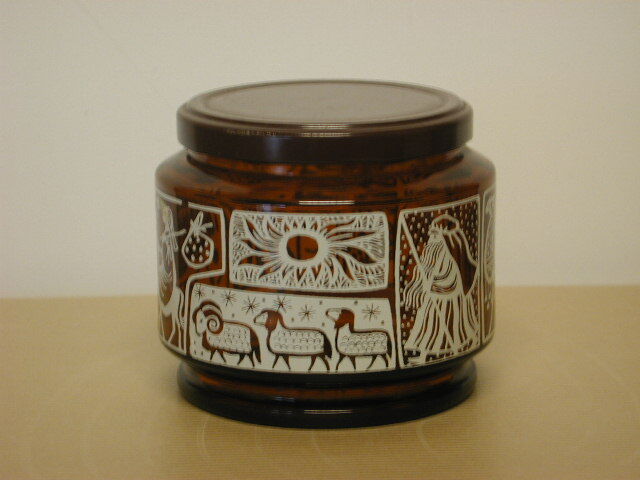 - BeschrijvingRonde pot voor De Gruyter Mokka oploskoffie van bruin doorzichtig glas met negen arabisch georienteerde witte tekeningen erop. Op de pot zit een platte, ronde, bruine metalen schroefdeksel. De pot is leeg.