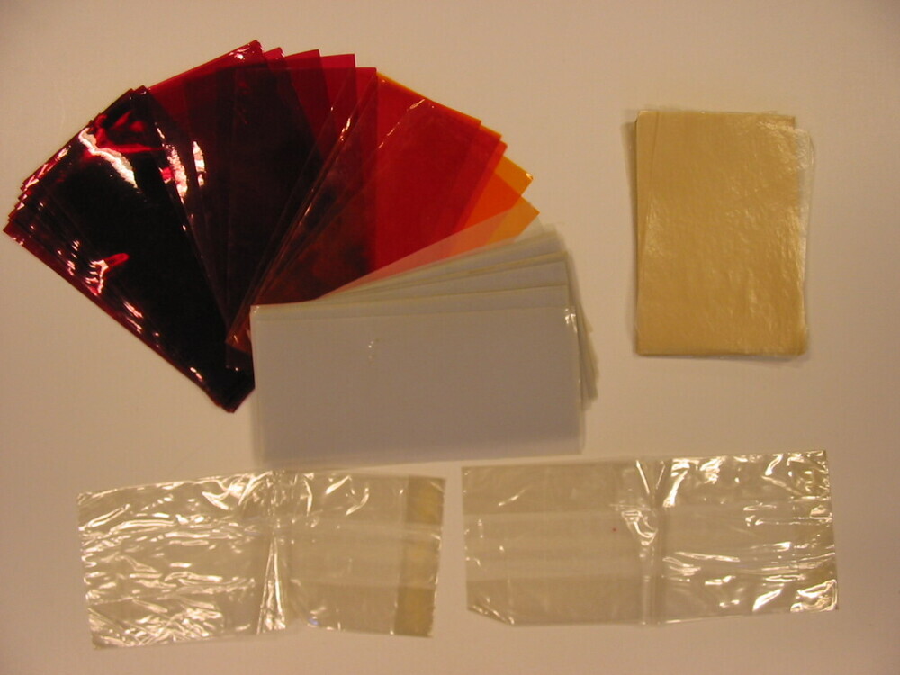 Plastic boterhamzakje met daarin vijftig vellen cellofaanmonsters in de kleuren rood, oranje en wit van verschillende dikte, Vierenzeventig vellen doorzichtige papiermonsters en twee doorzichtige plastic zakjes.