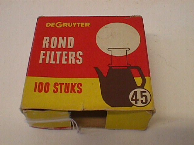 - BeschrijvingVerpakking voor De Gruyter koffiefilters, rond model, 100 stuks. Op de geel met rode verpakking staat een bruine koffiepot afgebeeld. Het pak is leeg.