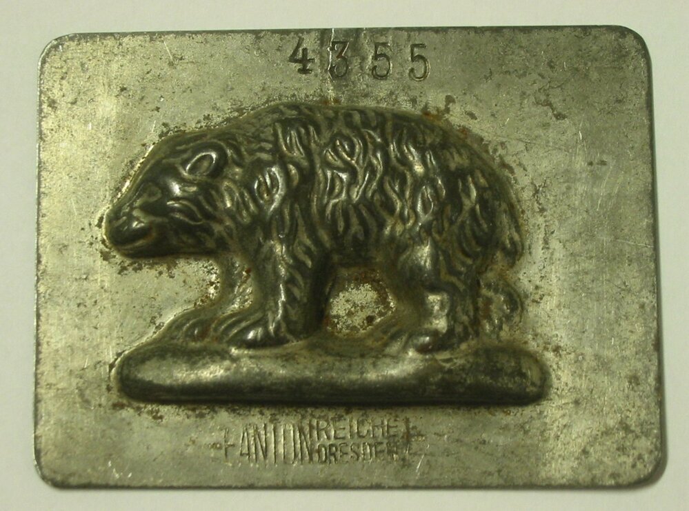 - BeschrijvingMetalen vorm bestaande uit een plat vlak met daarin de figuur van een beer uitgediept.