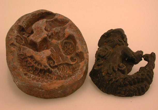 - BeschrijvingOvaalvormige vorm voor het afdrukken van een zeemeerman met zwaard en schild + afdruk. (oude inv. kaart niet aangetroffen)