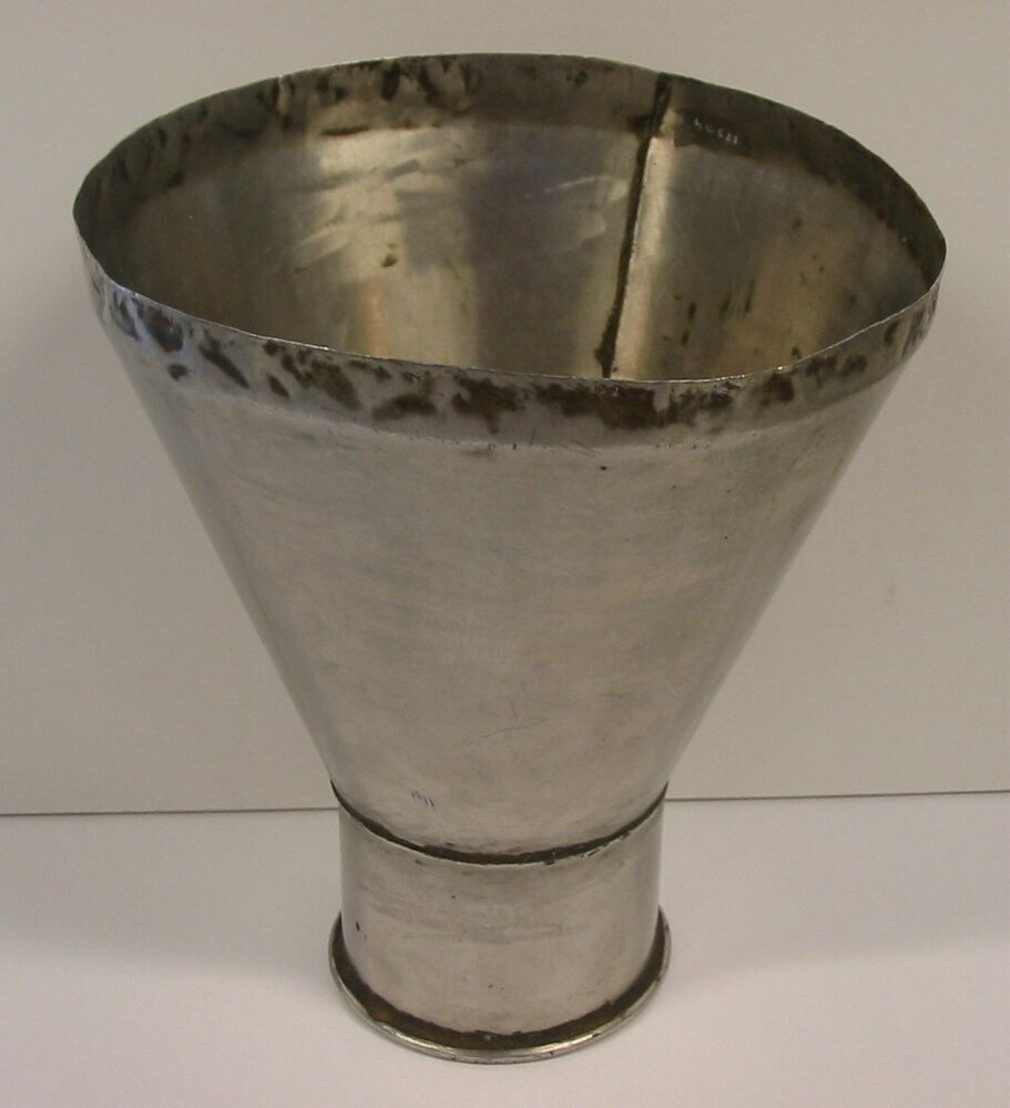 Metalen trechter gebruikt bij het productieproces in fabriek van 'De Gruyter'.
