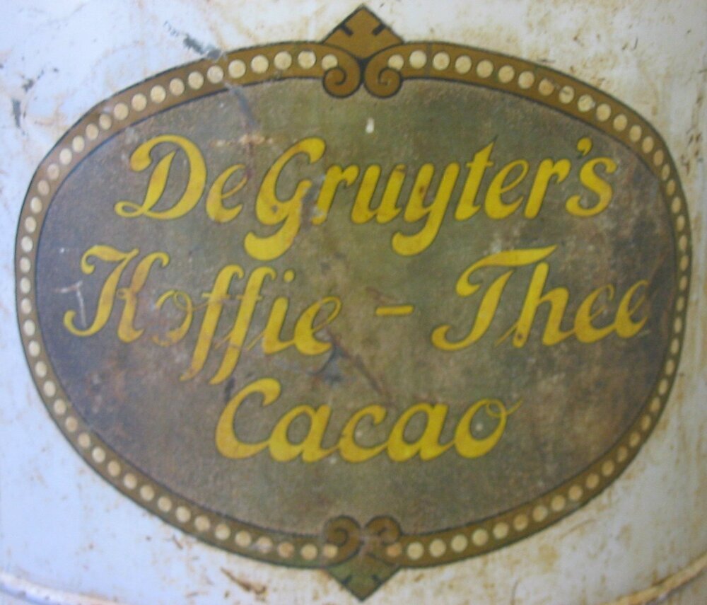 - BeschrijvingRonde metalen bus voor het opslaan en distribueren van koffie, thee en cacao. De bus heeft twee handvatten en een scharnierend deksel met sluiting. Op de bus is een geschilderd etiket met de tekst DE GRUYTER'S KOFFIE-THEE CACAO.