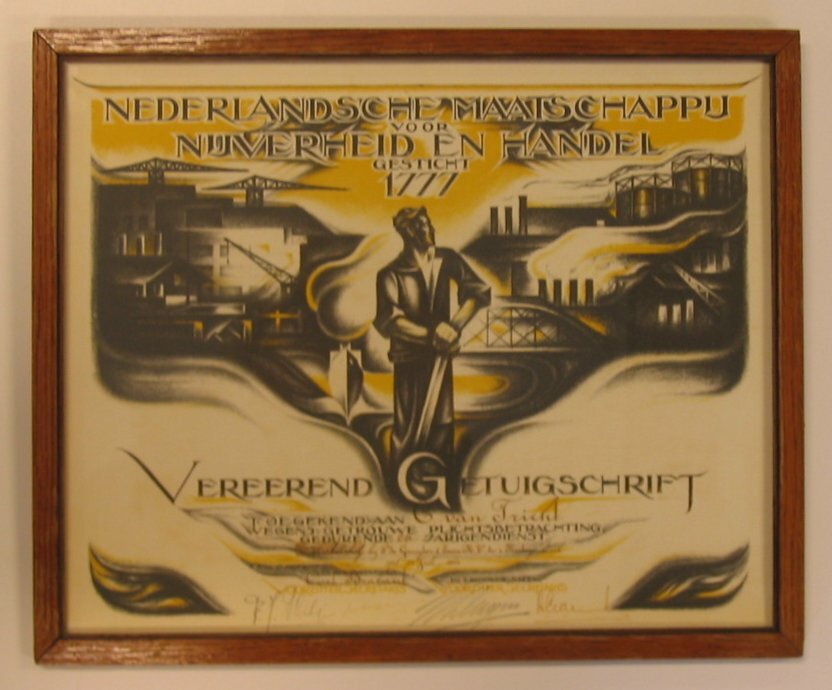 - BeschrijvingGetuigschrift van de Nederlandsche Maatschappij voor Nijverheid en Handel toegekend aan C. van Tricht wegens getrouwe plichtsbetrachting gedurende 25 jarige dienst als winkelchef. Het getuigschrift is ingelijst in een houten lijst.