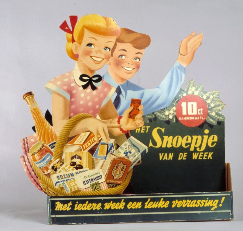 - BeschrijvingKartonnen uitstalling voor de verkoop van het snoepje van de week, voorstellende een zwaaiende jongen en een meisje met een volle boodschappenmand en een kassabon in haar hand.
