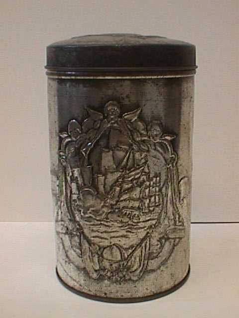 - BeschrijvingZilverkleurige ronde metalen bewaarbus met los deksel. Erop afgebeeld staat een wapen met onleesbare tekst en een historische zeeslag. De bus is leeg.