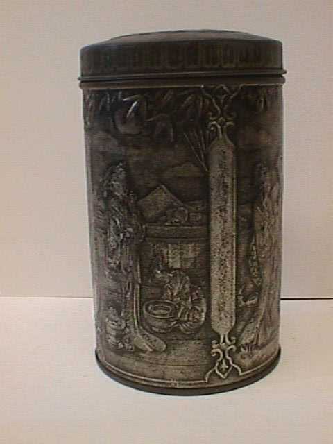 - BeschrijvingZilverkleurige ronde metalen bewaarbus met los deksel. Erop afgebeeld staan afbeeldingen van japanse dames in een huiselijk tafreel. De bus is leeg.