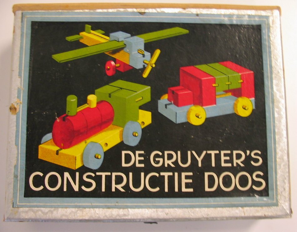 Rechthoekige bouwdoos met deksel, bekleed met zilverpapier. In de doos zitten blokjes, wieltjes en verbindingsonderdelen. In de doos bevinden zich twee velletjes met op elke vier bouwvoorbeelden. Dit nabouwen zal niet bij alk voorbeeld gaan, omdat er blokjes ontbreken. Op de doos zit een haakslot. Op de bovenzijde van de doos zit een afbeelding van een vliegtuig, een locomotief en een auto. Deze figuren kun je nabouwen. Onderdelen van deze doos zijn hoogstwaarschijnlijk terug te vinden in de bouwdozen met de inventarisnummers 17442 en 17444.