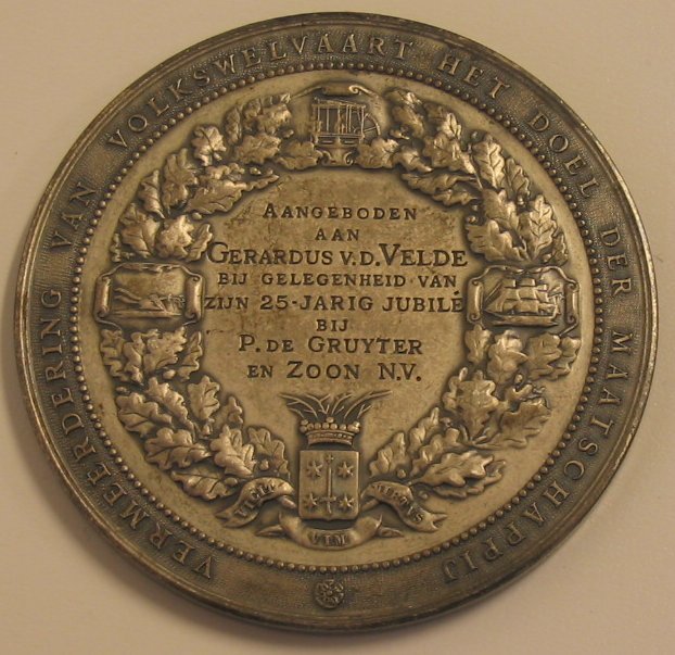 Metalen gedenkpenning ter gelegenheid van 25-jarig jubileum van Gerardus v.d. Velde. De penning zit in een zwartbekleed houten doosje met scharnierend deksel en knipsluiting. De doos is aan de binnenzijde bekleed met witte en bruine stof. Op de penning staat aan de voorzijde tekst in een krans en aan de achterzijde een vrouwfiguur, waarschijnlijk beschermheilige van de handel en nijverheid.