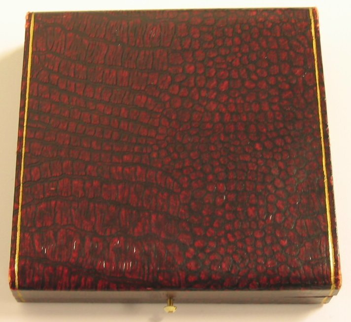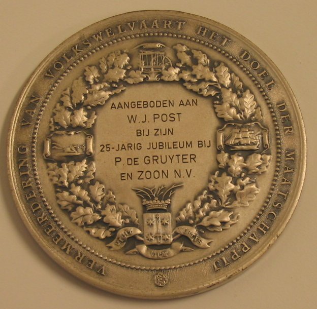Metalen gedenkpenning van Nederlandsche Maatschappij voor Nijverheid en Handel in doosje. De penning tis gemaakt ter gelegenheid van het 25-jarig jubilieum van W.J. Post bij P. de Gruyter en Zoon N.V. De penning ligt in een bruinbekleed, slangenlhuid-achtig, houten doosje met scharnierend deksel en knipsluiting. De doos is aan de binnenzijde bekleed met witte en rode stof.