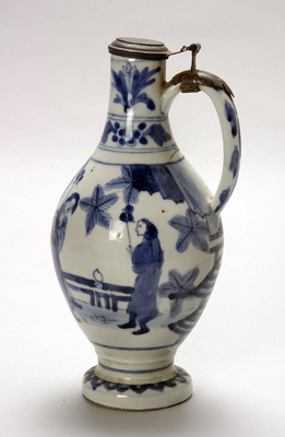 Brede voetring, middels insnoering overgaand in hoogslank, bolbuikig lichaam, dat schouderloos overvloeit in cilindrische hals. Staand oor van buik naar hals. Schildering met vier Japanse figuren en dito tuin, blauw op wit. Zilveren scharnierend deksel, bevestigd aan oor, de deksel vervaardigd van een Goudse vroedschapspenning. (diam. 2,9 cm, 1691-1723)