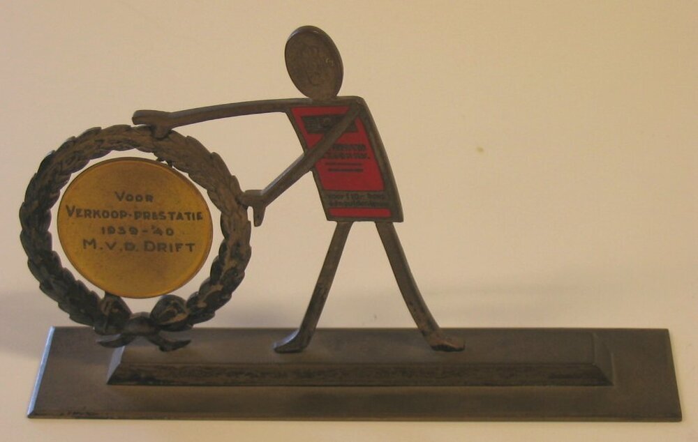 - BeschrijvingDG-mannetje houdt een lauwerkrans vast met daarin een penning waarop verkoopprestatie staat vermeldt. Mannetje en penning zijn van metaal en staan op een rechthoekige metalen sokkel.