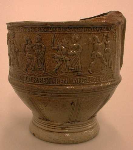 - geprofileerde voet - onderste deel van lichaam schuin uitlopend, versierd met vertikale groeven, het bovenste rechte deel bevat, op een klein deel ter weerszijden van de oorstaart na, een fries met 2 muzikanten en 9 dansende boerenparen. onder en boven een opschrift: JEVRIEN: DV:MVS DAPPER:BLASEN:SO:DANSEN:DEI:BUREN:ALS:WEREN:SY:RASEN:FRY:VERSPRICHT:BASTOR:ICH:VER:DANS:DY:KAP:MIT DEN KOR WER:SIN:HOEPT:WILT:HALDEN:GANSZ:DER:LAS:DEN:HVNDEN:ER:BRVLVEFT:ENDE:DEI:BVREN:EREN:DANSZ:G:E:1590 - klein teruglopend deel van lichaam - staart en aanzet van oor op dit teruglopende en rechte deel van het lichaam - grijs/bruin gevlekt zoutglazuur