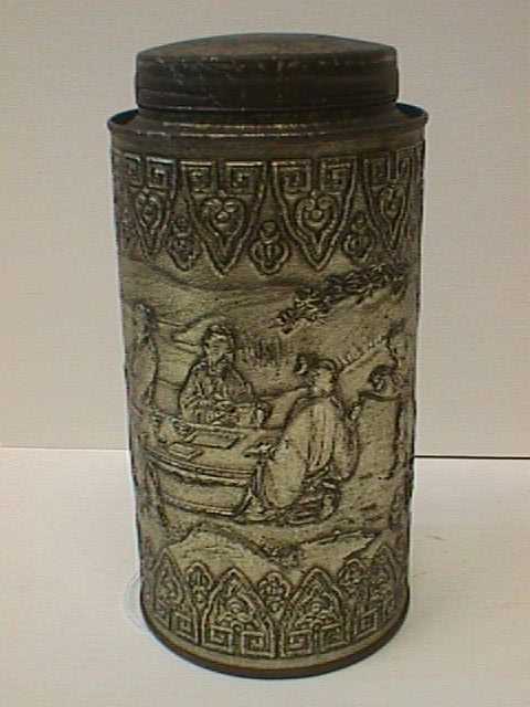 - BeschrijvingMetalen bewaarbus met los rond deksel en met een oosters tafreel erop afgebeeld, tonend vier mannen zittend op de grond aan een lage tafel met links van hen een staande man die in de verte wijst en rechts een man die drinken inschenkt en een man bij een tafel met kookgerei. De bus is leeg.