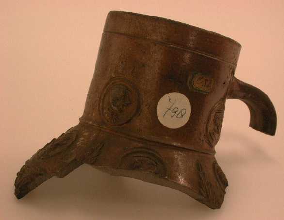 - kleine scherf van de buik, versierd met rozet en ranken - overgang buik/schouder door ribbel gemarkeerd - schouder versierd met afwisselend een medaillon met kop en bladeren aan weerszijden van een tak - overgang schouder/hals door hoekige ribbel gemarkeerd - cilindrische gladde hals met van boven een groef, versierd met 3 medaillons waarin dezelfde koppen als op de buik in reliƫf staan - bandvormig vertikaal oor aangezet onder mondrand