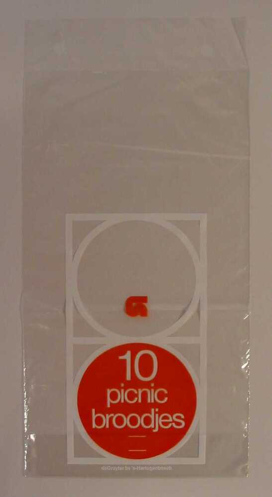- BeschrijvingZakje van doorzichtig plastic met als opschrift: 10 picnic broodjes. De Gruyter bv 's-Hertogenbosch, met het De Gruyter logo van na 1972.