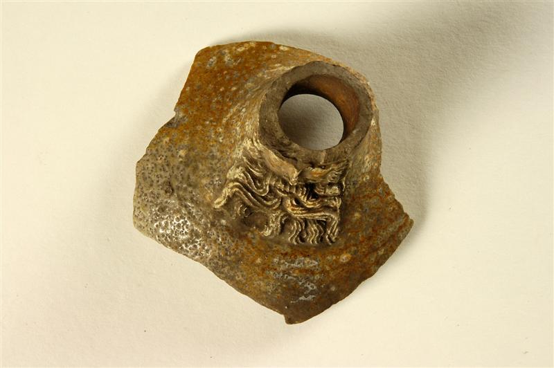 - Beschrijving- deel van schouder overgaand in nauwe hals - van de baardman die aangebracht is op de hals en de schouder zijn de baard en de onderste helft van het gezicht nog aanwezig -bruin/grijs gevlekt zoutglazuur