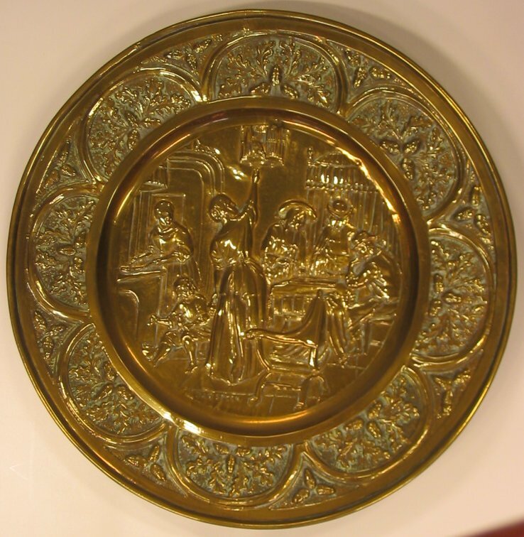 - BeschrijvingRond metalen sierbord met in het midden een voorstelling naar Jan Steen. Drie mannen zitten rondom een tafel, een vrouw kookt, een andere vrouw wijst naar een vogelkooi en op de grond zit een kindje. De rand is versierd met eikenblad en eikels. Aan de achterkant is een ophangoog bevestigd.