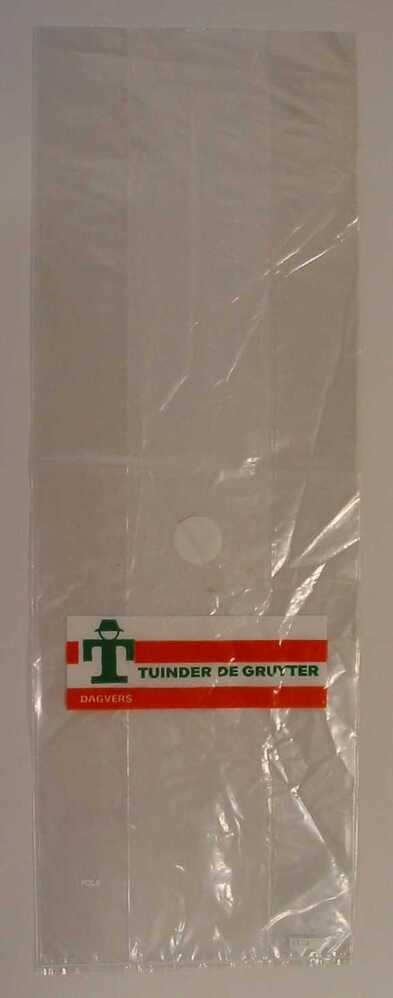 - BeschrijvingDoorzichtig plastic zak van tuinder De Gruyter. Over de voorzijde van het zakje loopt een oranje-wit gestreepte blak met tekst. Boven de balk bevindt zich een witte stip.