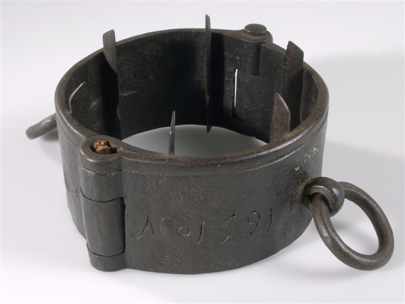 - BeschrijvingBuitenzijde band, inscriptie: A o 1591 In 1591 betaalde de stad 15 gulden aan Henrick de Smit, voor de door hem vervaardigde halsband en schroeven t.b.v. de scherprechter
