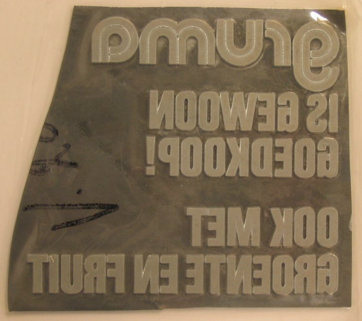 Metalen drukplaat met de tekst GRUMA IS GEWOON GOEDKOOP! OOK MET GROENTE EN FRUIT.
