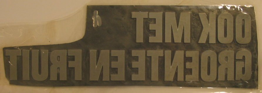 Metalen drukplaat met de tekst OOK MET GROENTE EN FRUIT.