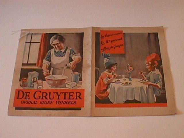 - BeschrijvingPapieren folder met voorop de De Gruyter slogan en een afbeelding van twee kinderen met feestmutsen aan tafel. Binnenin staan recepten en wenken en op de achterzijde de tekst DE GRUYTER OVERAL EIGEN WINKELS bij een afbeelding van een voedselbereidende mevrouw.