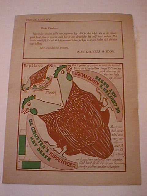 - BeschrijvingPapieren folder met voorop een woord van P. de Gruyter & Zoon aan de kinderen en een uitknip kip en achterop een stripverhaal over de poes en de pudding.