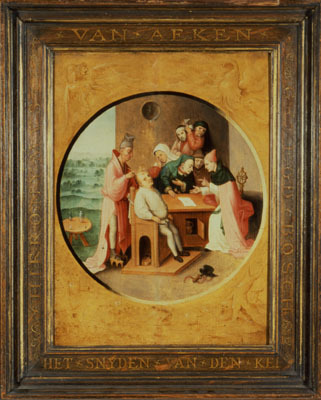 In een medaillon is de keisnijding voorgesteld. De kwakzalver snijdt een kei uit het hoofd van een patiënt. Aan tafel toont een man een reeds uitgesneden kei aan twee andere mannen. Een vrouw bedekt haar ogen uit afschuw en het hoofd van een behandelde patiënt wordt verbonden. In een nis zit een uil. Rond het medaillon zijn in gele en witte tinten beesten en monsters voorgesteld.
