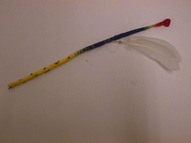 Kleine gebedsstok met textiel omwikkeld en met twee witte veertjes