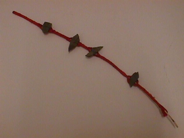 Kleine gebedsstok omwikkeld met rode stof met vier steentjes
