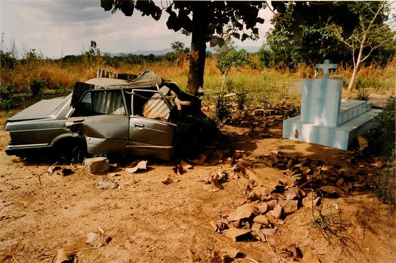 Een graf met steen en een kapotte auto.