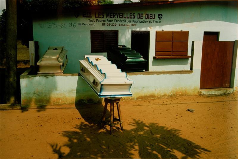 Huis waarvoor drie lijkkisten zijn opgesteld.
