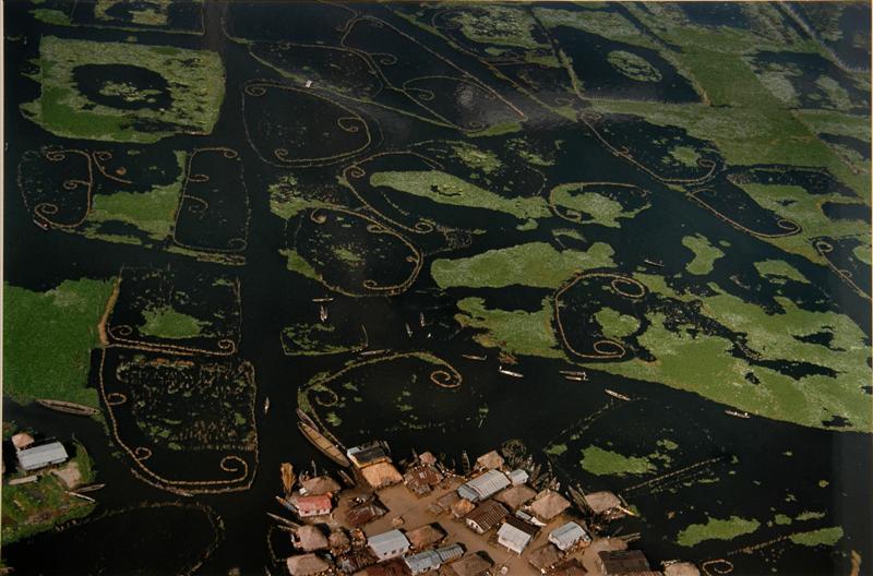 - BeschrijvingLuchtfoto van waterrijk gebied met bootjes, uitgezette visnetten en wat huisjes op het vaste land.