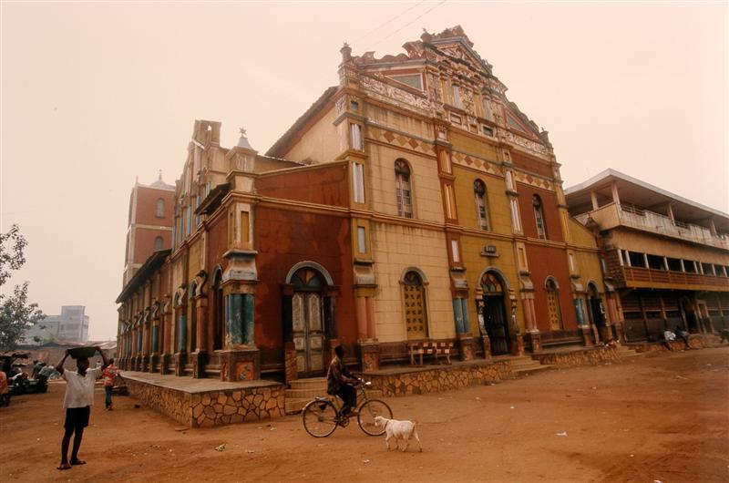 Straatbeeld met kleurrijk versierde moskee.