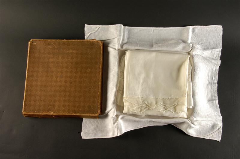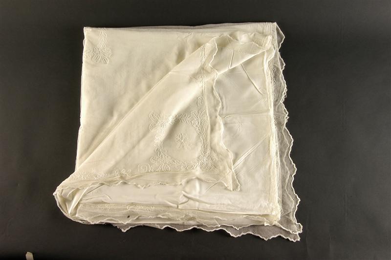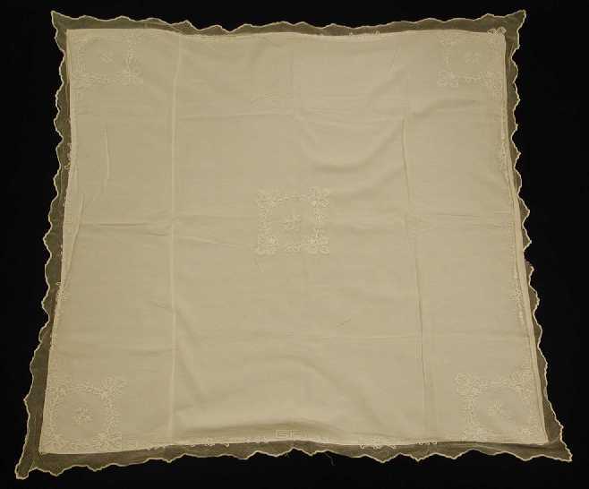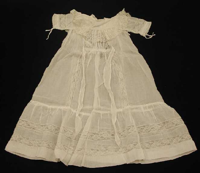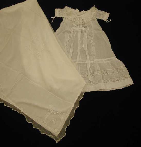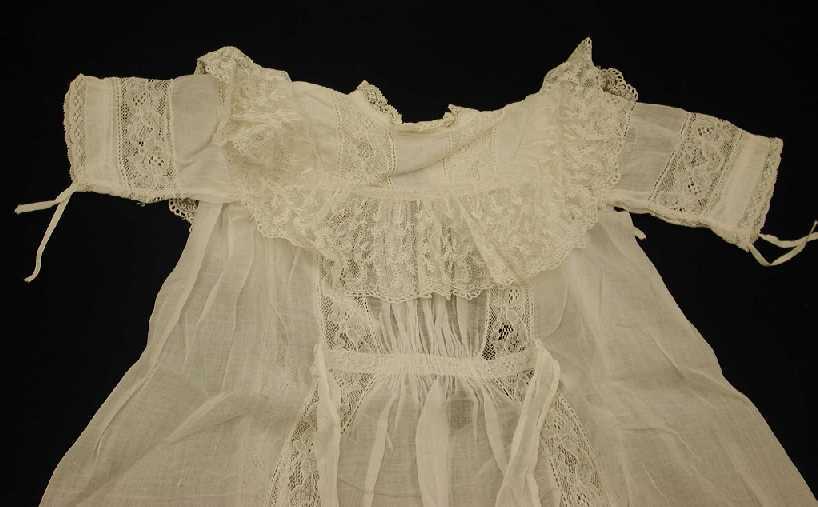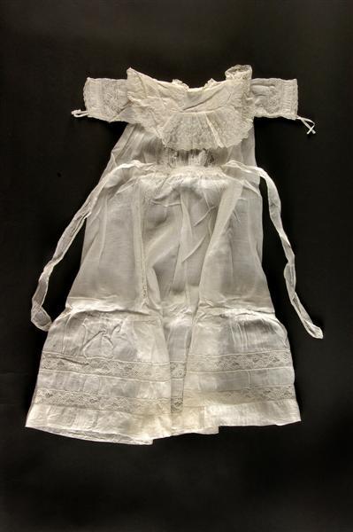 - BeschrijvingDoopjurk van witte katoenen batist versierd met kant en een doopsprei.