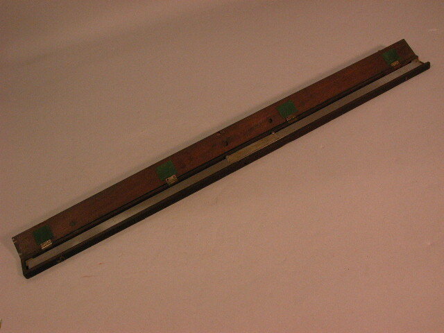 - BeschrijvingMeter in doos. De verdeling is in decimeters. De eerste decimeter is verdeeld in centimeters en millimeters. De eindmaat heeft messing hoekstukjes. De meter is voorizen van de letters NB; de meter is uitgereikt aan het arrondissementskantoor van Noord-Brabant.
