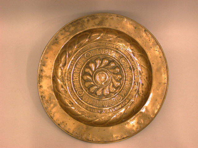 Geelkoperen collecteschaal met iets holle bodem. Rond het wat hogere centrum een 4,5 cm breed fries met druppelvormige knorren, een 3,5 cm breed fries met 4 maal hetzelfde woord in onleesbare (fantasie?) gotische kapitalen (van elkaar gescheiden door een stempel met lopende leeuw in cirkel) en een 2 cm. breed fries met in kapitalen repeterende woorden "DI " DAL " WUNDT ", van elkaar gescheiden door een tinroosstempel. In de vlakke rand is repeterend rondom een kruisbloemstempel ingeslagen.