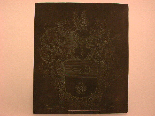 - BeschrijvingPlaat met, in spiegelbeeld, het gegraveerde wapen van de fam. Peymans: Doorsneden boven blauw met een gouden ploeg, onder zilver met een rode roos. Het geheel in een Regence (?) omlijsting, bekroond met een traliehelm met als helmteken een antieke vlucht van goud en blauw, waartussen een rode roos. Onderschrift LABORA FLOREBIS.