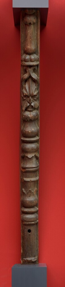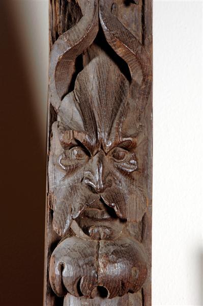 - BeschrijvingKorbeel met snijwerk versierd. Op het korbeel een mascaron met afhangende snor onder twee voluten